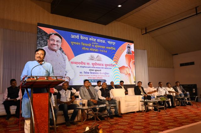 चंद्रपूर येथील आर्य वैश्य स्नेह मंडळाच्या वतीने गुणवंत विद्यार्थी गौरव सोहळा आयोजित करण्यात आला. यावेळी ना. श्री. मुनगंटीवार बोलत होते. मुंबई येथील टाटा इन्स्टिट्यूट अॉफ फंडामेंटल रिसर्च येथील शास्त्रज्ञ प्रो. डॉ. विवेक पोलशेट्टीवार यांची यावेळी विशेष उपस्थिती होती. याशिवाय संस्थेचे अध्यक्ष विजय गंपावार, सचिव नीरज पडगिलवार, कोषाध्यक्ष मनोज राघमवार, जयंत बोंनगीरवार, अभय निलावार, विलोक राचलवार, राजेश पत्तीवार, सागर मुक्कावार, राजेश्वर चिंतावार, शंकर गंगशेट्टीवार, अविनाश उत्तरवार, गिरीधर उपगन्लावार, वैभव कोतपल्लीवार आदींची उपस्थिती होती.