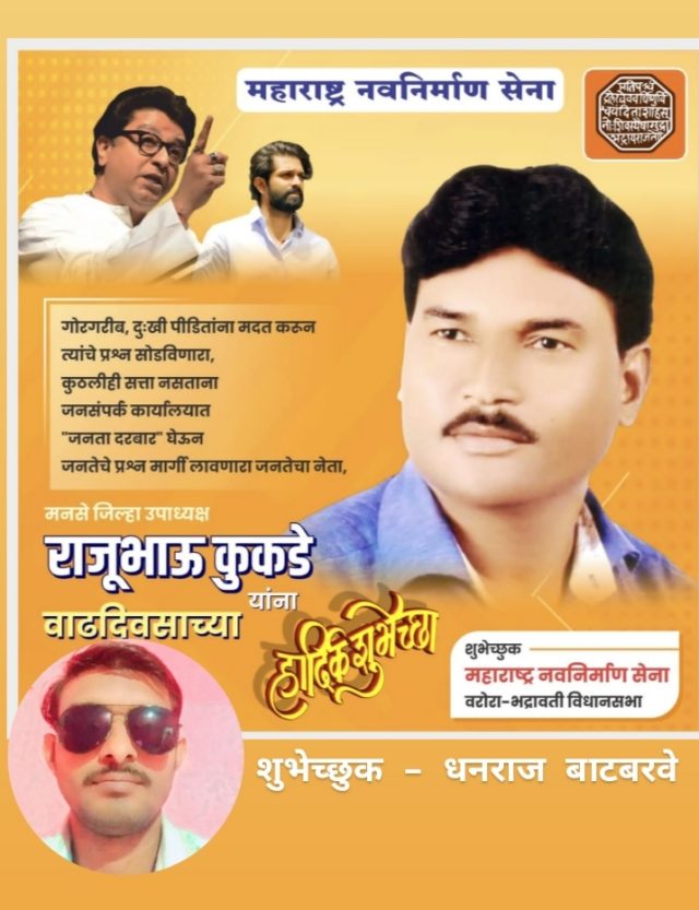 वरोरा भद्रावती विधानसभा क्षेत्रातील महाराष्ट्र नवनिर्माण सेनेचे तमाम हिंदू जननायक सन्माननीय राज साहेब ठाकरे यांच्या सैनिक युवा नेतृत्व वरोरा भद्रावती तालुक्यातील लाखो शेतकऱ्यांना न्याया हक्कासाठी लढा देणारे माणूस ओडखले जानारे मनसे चे जिल्हा उपाध्यक्ष राजूभाऊ कुकडे यांना वाढदिवसाच्या खूप शुभेच्छा 🎂