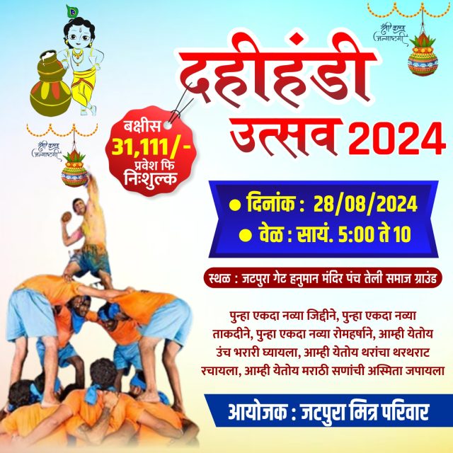 जन्माष्टमीच्या मुहूर्तावर या दहीहंडी उत्सवाचे आयोजन करण्यात आले असून, यामध्ये एक मनोरंजक स्पर्धा होणार असून विजेत्याला 31,111 रुपयांचे बक्षीस देण्यात येणार आहे. हा कार्यक्रम जटपुरा मित्र परिवारातर्फे आयोजित करण्यात आला असून सर्वांनी उपस्थित राहण्याची विनंती जटपुरा गेट मित्र परिवार करत आहे सोबतस आपल्या सर्वांचे स्वागत आहे.