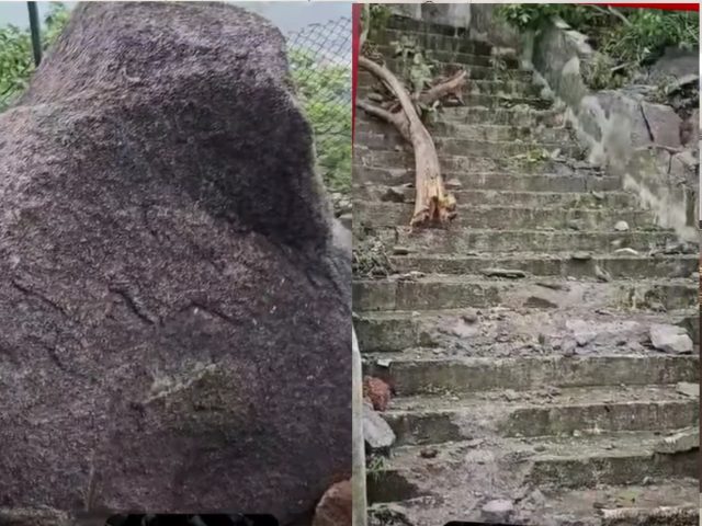 डोंगरगड (छ.ग.) :- बमलेश्वरी देवीच्या पवित्र डोंगरावर आज पहाटेच्या सुमारास कुदरतचा भीषण तांडव पाहायला मिळाला. गेल्या काही दिवसांपासून सुरू असलेल्या मुसळधार पावसामुळे पहिल्यांदाच इतकी मोठी चट्टाण खाली कोसळल्याची घटना समोर आली असून, यामुळे परिसरातील अनेक झाडे उध्वस्त झाली आहेत, तसेच डोंगराकडे जाणारा मुख्य रस्तादेखील खचला आहे.