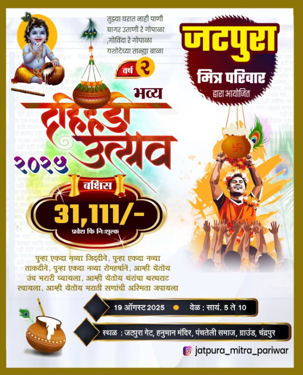 рдЪрдВрджреНрд░рдкреВрд░┬а :-┬а рдкреБрдиреНрд╣рд╛ рдПрдХрджрд╛ рдирд╡реНрдпрд╛ рдЬрд┐рджреНрджреАрдиреЗ, рдкреБрдиреНрд╣рд╛ рдПрдХрджрд╛ рдирд╡реНрдпрд╛ рддрд╛рдХрджреАрдиреЗ, рдкреБрдиреНрд╣рд╛ рдПрдХрджрд╛ рдирд╡реНрдпрд╛ рд░реЛрдорд╣рд░реНрд╖рд╛рдиреЗ тАУ рдЪрдВрджреНрд░рдкреВрд░рдХрд░рд╛рдВрдЪреНрдпрд╛ рд╣реГрджрдпрд╛рдЪреА рдзрдбрдзрдб рд╡рд╛рдврд╡рдгрд╛рд░рд╛, рдорд░рд╛рдареА рд╕рдгрд╛рдВрдЪреА рдЕрд╕реНрдорд┐рддрд╛ рдЬрдкрдгрд╛рд░рд╛, “рдЬрдЯрдкреБрд░рд╛ рдорд┐рддреНрд░ рдкрд░рд┐рд╡рд╛рд░” рдЖрдпреЛрдЬрд┐рдд рджрд╣реАрд╣рдВрдбреА 2025 рдЙрддреНрд╕рд╡ 19 рдСрдЧрд╕реНрдЯ рд░реЛрдЬреА рд╕рд╛рдпрдВрдХрд╛рд│реА 5 рддреЗ рд░рд╛рддреНрд░реА 10 рдпрд╛ рд╡реЗрд│реЗрдд рдЬрдЯрдкреБрд░рд╛ рдЧреЗрдЯ, рд╣рдиреБрдорд╛рди рдордВрджрд┐рд░, рдкрдВрдЪрддреЗрд▓реА рд╕рдорд╛рдЬ рдЧреНрд░рд╛рдЙрдВрдб, рдЪрдВрджреНрд░рдкреВрд░ рдпреЗрдереЗ рднрд╡реНрдпрджрд┐рд╡реНрдп рд╕реЛрд╣рд│реНрдпрд╛рдд рдкрд╛рд░ рдкрдбрдгрд╛рд░ рдЖрд╣реЗ.