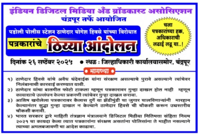 पडोली पोलीस स्टेशन चे ठाणेदार योगेश हिवसे हे अवैध धंदेवाईक यांचे संरक्षण करतात दरम्यान झेंडीमुंडी जुगार चालविणाऱ्या अवैध धंदेवाईक कैलास दुर्गे यांच्या अड्ड्यावर पत्रकार आशिष खरोले हे बातमी करिता गेले असता त्यांना अवैध व्यवसाई बेदम मारहान केली, या दरम्यान पत्रकाराने त्यांच्या विरोधात पडोली पोलीस स्टेशन मध्ये तक्रार करायला गेल्यानंतर अवैध व्यवसायीकांवर गुन्हे दाखल करण्याचे सोडून उलट पोलिसाकडून पत्रकाराला धमकावल्या गेले ही बाब माहीत झाल्यावर भूमिपुत्राची हाक न्यूज पोर्टल चे संपादक राजू कुकडे यांनी त्या विरोधात बातमी प्रकाशित केली, मात्र या बातमी वरून ठाणेदार योगेश हिवसे यांनी त्यांच्या कार्यक्षेत्रात नसताना खाकी वर्दीचा दुरुपयोग करून राजू कुकडे यांचेवर जाणीवपूर्वक गुन्हे दाखल केले, ही अत्यंत गंभीर बाब असल्याने व लोकशाहीच्या चौथ्या स्तंभास कमजोर करण्याचा घाट घातला जात असल्याने त्या विरोधात इंडियन डिजिटल मिडिया अँड ब्रॉडकास्ट असोसिएशन चंद्रपूर तर्फे सर्व पत्रकारांना घेऊन जिल्हाधिकारी कार्यालयासमोर उद्या 26 सप्टेंबर ला ठीक 11.00 वाजेपासून ठिय्या आंदोलन करण्यात येणार आहे. या आंदोलनास जेष्ठ पत्रकार किशोर पोतनवार यांच्यासाह जिल्ह्यातील शेकडो पत्रकार उपस्थित राहणार असल्याचा अंदाज आहे.