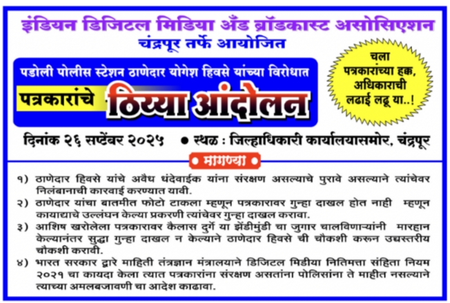 भारत सरकार ने माहिती तंत्रज्ञान नियम, २०२१ अनुसार इलेक्ट्रॉनिक्स आणि माहिती तंत्रज्ञान मंत्रालयाने माहिती तंत्रज्ञान ( डिजिटल मीडिया नीतिमत्ता संहिता) नियम, २०२१ अधिसूचिना काढली आहे, त्यानुसार कुठल्याही न्यूज पोर्टल व इलेक्ट्रॉनिक न्यूज चैनेल, यु ट्यूब चैनेल च्या पत्रकारावर पोलीस स्टेशन मध्ये बातम्या संदर्भात सरळ गुन्हा नोंद होऊ शकतं नाही, त्यासाठी या कायाद्यानुसार डिजिटल मीडिया नीतिमत्ता संहिता नुसार अगोदर संबंधित संपादक यांचेकडे तक्रार नोंद करावी लागते, त्यांनंतर जर सकारात्मक उत्तर संपादक यांनी दिले नाही तर त्यांचे जिल्हा न्यायालयाचे माजी न्यायाधीश किंव्हा उच्च न्यायालयाचे अधिवक्ता यांची नियुक्ती केलेल्या डिजिटल मीडिया मध्यस्थाकडे प्रकरण वर्ग केल्यानंतर त्यांचेकडे सुनावणी झाल्यानंतर मग गुन्हा नोंद करायचा की नाही याबद्दल निर्णय पोलीस प्रशासन घेऊ शकते, मात्र पडोली पोलीस स्टेशन चे ठाणेदार योगेश हिवसे यांना सदर कायाद्याचे ज्ञान नसल्याने त्यांनी ज्या पद्धतीने आपल्या पदाचा दुरुपयोग करून माहिती तंत्रज्ञान मंत्रालयाने मंजूर केलेल्या डिजिटल मीडिया नीतिमत्ता संहिता नियम, २०२१ चे उल्लंघन केले आहे, या प्रकरणी त्याचेवर पत्रकारांचा पत्रकार सरक्षण अधिनियम 2017 व पत्रकार सुरक्षा अधिनियम 2019 अंतर्गत पत्रकारांच्या अभिव्यक्ती स्वातंत्र्यावर झालेल्या हल्ल्याची दखल घेऊन व उच्चस्तरीय चौकशी करून त्यांचेवर पत्रकार संरक्षण अधिनियम अंतर्गत गुन्हा दाखल करावा या मागणी करिता जिल्ह्यातील सर्व पत्रकार संघटना पदाधिकारी आणि वार्ताहर पोलीस प्रशासनाविरोधात जिल्हाधिकारी कार्यालयासमोर ठिय्या आंदोलन उद्या दिनांक 26/9/2025 ला सकाळी 11.00 ते सायंकाळी 4.00 वाजेपर्यंत करण्यात येत आहे, तरी या आंदोलनात सर्व पत्रकारांनी आपल्या हक्क अधिकारासाठी आंदोलनात सहभागी व्हावं असं आवाहन इंडियन डिजिटल मिडिया अँड ब्रॉडकास्ट असोसियएशन चंद्रपूरचे जिल्हाध्यक्ष